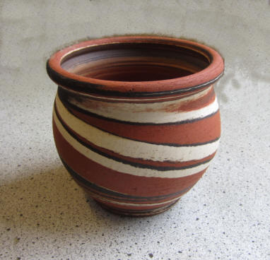 Für den Topf benutze ich einen handgetöpferten, dreifarbig marmorierten Tontopf aus einer heimischer Töpferei.