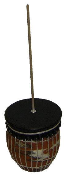 Mit einem feuchtem Leinentuch wird an dem Holzstab gerieben. Dabei entsteht ein tiefer brummender Ton.